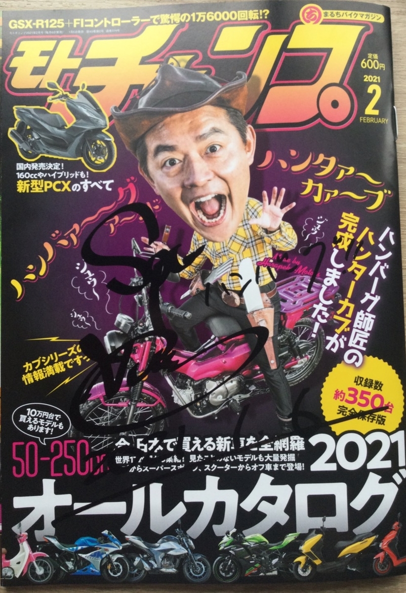 バイク雑誌、モトチャンプの公式ツイッターでの"ハンバーグ師匠のサイン本"プレゼント企画に応募し、当選しました。
